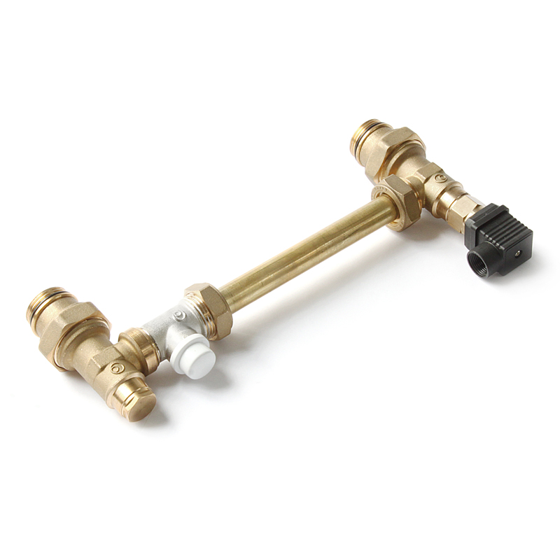 Байпас в сборе с регулирующим микрометрическим клапаном и предохранительным термостатом (температура отключения циркуляционного насоса = 50°С) с возможностью установки гильзы и выносного датчика контроля температуры теплоносителя.