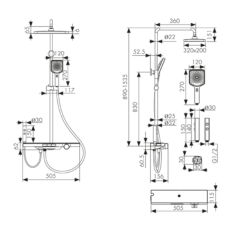 | Комплектация | смеситель; релинг; верхний душ; душ. лейка; держатель лейки; шланг; гиг.лейка; шланг; крепления |