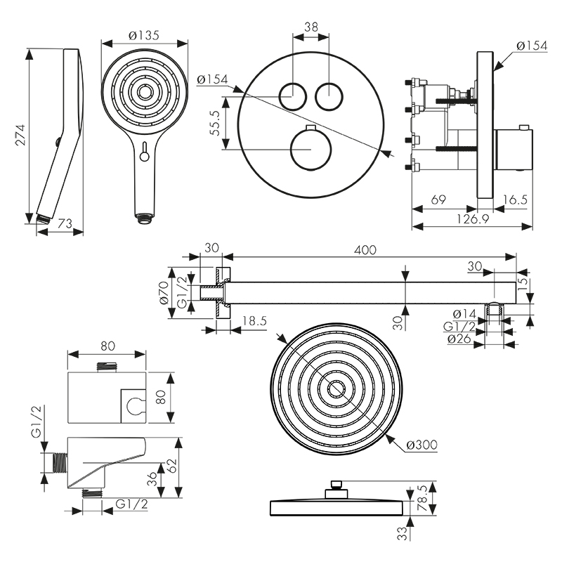Душевая система KAISER Sano с термостатом скрытого монтажа, поворотн. держатель (4-jet, стац. лейка Ø300*33mm) /Белый матовый