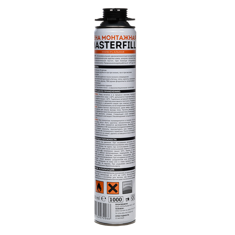MasterFill Universal — это универсальная однокомпонентная полиуретановая пена, предназначенная для заделки швов, зазоров и прочих строительно-технологических пустот, при помощи специального монтажного пистолета. Предназначена для работы от -10 °Сдо +35 °С.