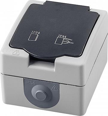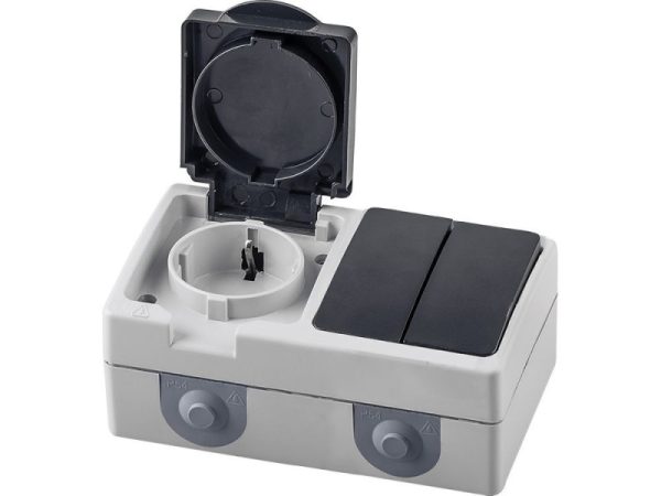 0,00 ₽Блок: розетка одноместная с заземляющим контактом открытой установки, 250В, 16А + выключатель двухкл