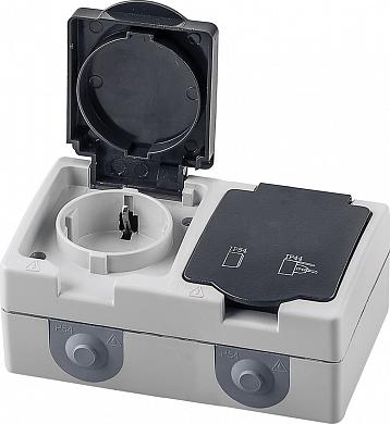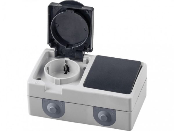Блок открытой установки: роз. с заз.конт.250В 16А + выключ. однокл.250В,10А,серый/графит