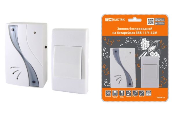Войдите, чтобы увидеть ценыЗвонок беспроводной на батарейках ЗББ-11/4-32М (32 мелодии, кнопка IP30, 2х1,5В ААА) TDM/ 1