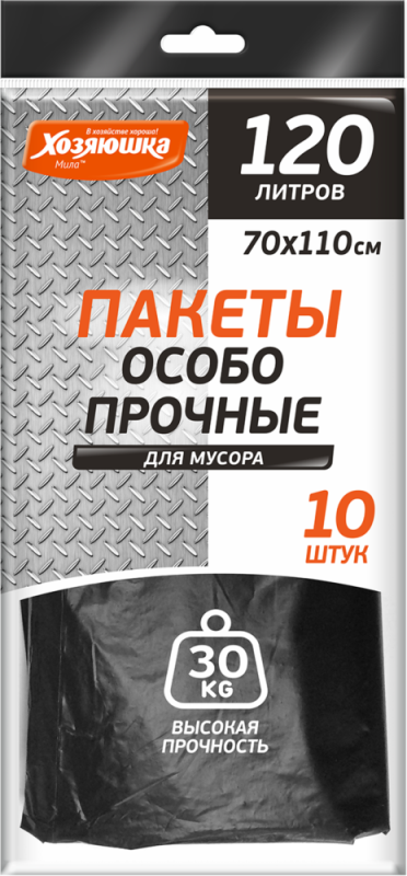 Войдите, чтобы увидеть ценыПакеты для мусора ПВД 120 л*10 шт 30 мкм ХОЗЯЮШКА Мила ОСОБОПРОЧНЫЕ В ПЛАСТАХ