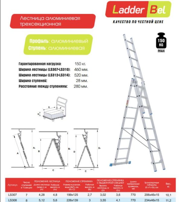 Лестница LadderBel 3х8 ступеней алюминиевая трехсекционная (5.12/3.55/2.26м)