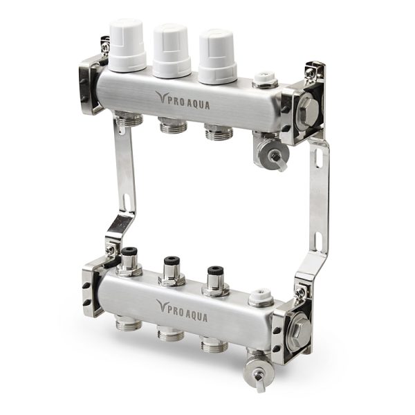 7 100,00 ₽Коллекторная группа (отопл.) с регулировочными клапанами 3 вых., 230 мм, 1 x 3/4 PRO AQUA