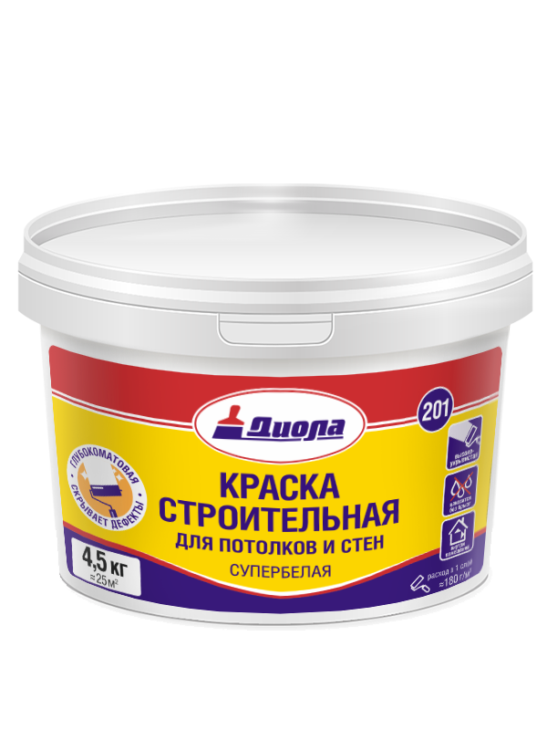 Войдите, чтобы увидеть ценыКраска ВД Диола-201 строительная для потолков и стен супербелая 1,5кг