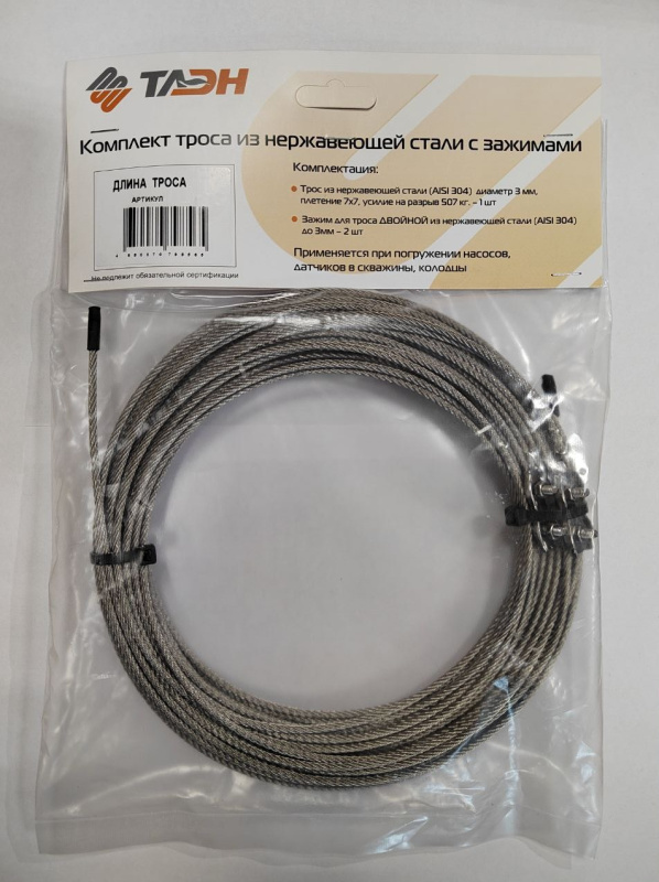 Комплект троса из нержавеющей стали, 3 мм, с зажимами, 15м ТАЭН