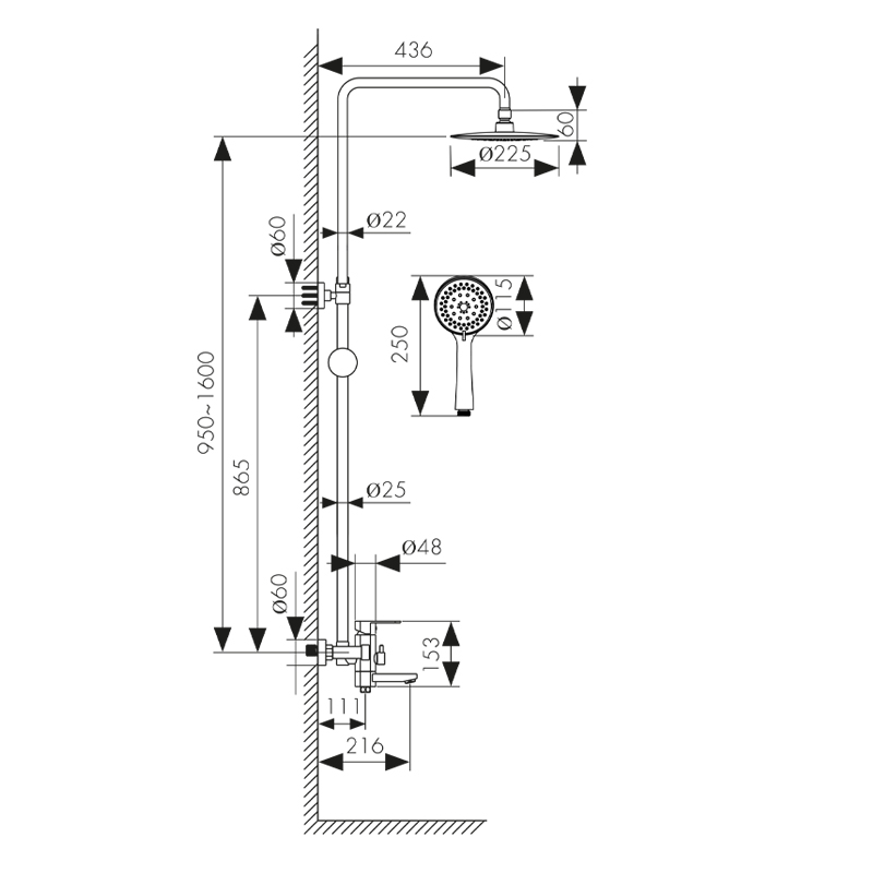 смеситель; релинг; верхний душ; душевая лейка; держатель лейки; шланг; крепления |