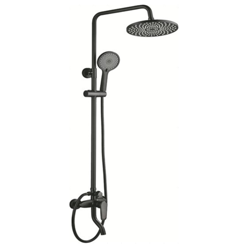 Душевая система (смеситель с кор.изливом,стойка,верх.душ) ЧЕРНЫЙ (силумин) RAINSBERG R9074H