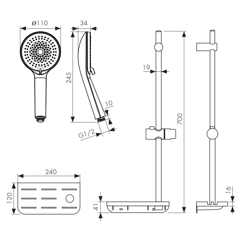 Душевой гарнитур KAISER с душем 4-jet, Ø19х700, полка(пластик/белая/240х120х16мм) /Нержавейка/Хром