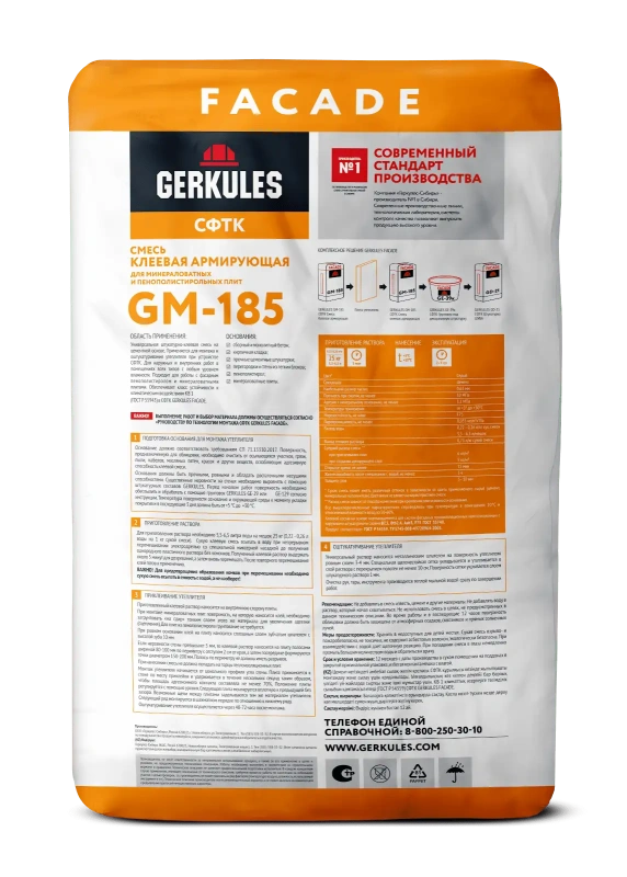 Клеевая армирующая смесь GM-185 – системный продукт. Он входит в состав СФТК «GERKULES FACADE» и поэтому к нему предъявляются особые требования ГОСТ:
