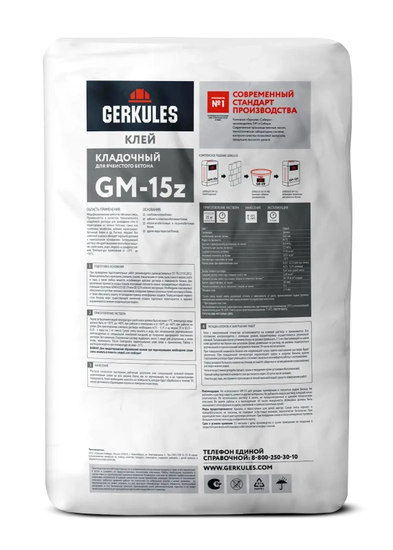 Состав клея для ячеистого бетона GM-15z: цементно-песчаная смесь, минеральные компоненты и модифицированные порошковые добавки водорастворимых полимеров ведущих европейских производителей.