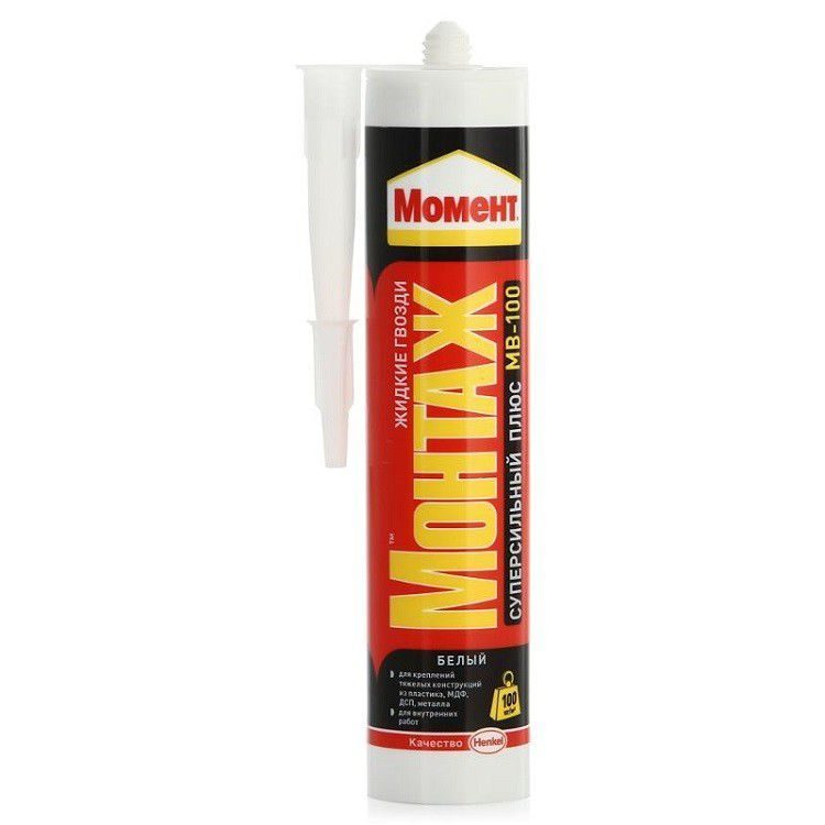 Момент Монтаж Суперсильный МВ-100 белый обладает высокой начальной силой склеивания (100 кг/м2) и отлично подходит для различных ремонтных работ. Дерево, металл, ПВХ, керамика, ДСП, МДФ, гипсокартон, пробка, полистирол, пенопласт, гипс и другие подобные материалы. Не подходит для для полиэтилена, полипропилена, тефлона.