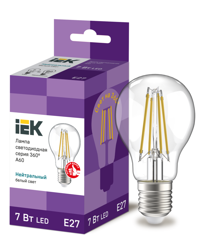Лампа светодиодная A60 шар прозрачная 7Вт 230В 4000К E27 серия 360° IEK
