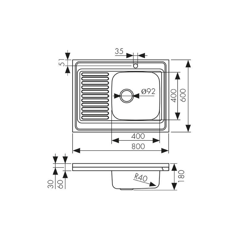 Мойка из нержавейки «KAISER» накладная 800×600*0.8mm хром правая/сифон