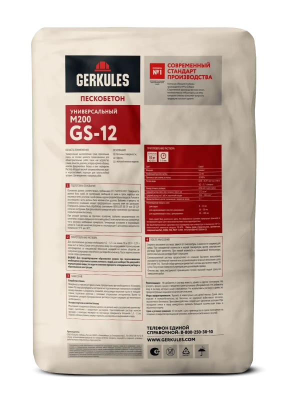 Свойства: Зимний Песокобетон М200 «Геркулес» GS-12z представляет собой сухую смесь на основе мелкозернистого плотного заполнителя, кварцевого песка и портландцемента.