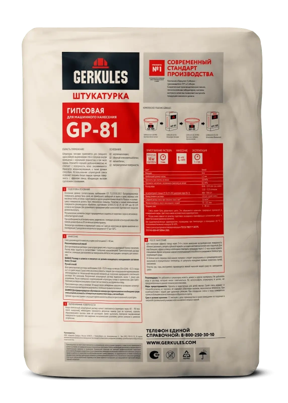 Свойства: Сухая гипсовая штукатурная смесь GP-81 представляет собой смесь гипса с кварцевым песком, природными наполнителями и полимерными добавками.
