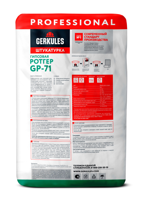 Свойства: Сухая гипсовая штукатурная смесь GP-71 представляет собой смесь гипса с кварцевым песком, природными наполнителями и полимерными добавками.