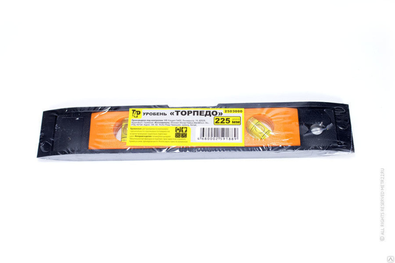 Три глазка на корпусе пластикового магнитного уровня 225 мм Торпедо обеспечивают возможность контроля поверхностей в трех различных положениях: горизонтальном, вертикальном и под углом 45°