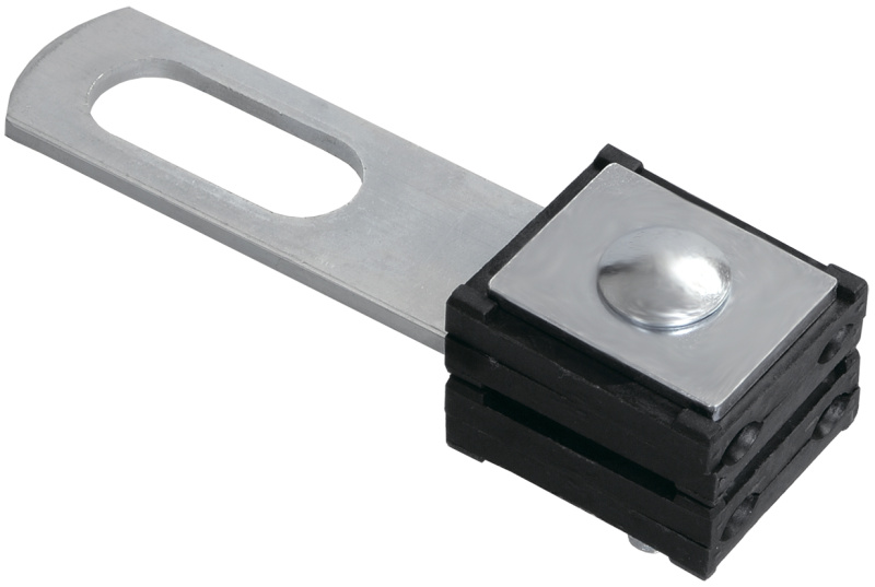 Зажимы анкерные ЗАБу предназначены для анкерных креплений четырех самонесущих изолированных проводов абонентов. Особый рельеф поверхности клиньев обеспечивает надежную фиксацию проводника, препятствуя его выскальзыванию, не повреждая при этом изоляцию провода. Все детали выполнены из полимеров, устойчивых к ультрафиолетовому излучению и погодно-климатическим условиям. Зажим анкерный ЗАБу 4×10-35 изготовлен из стали горячего цинкования, устойчивой к коррозии, и полимеров. Конструкция зажима позволяет легко превратить его в промежуточный (поддерживающий) зажим поворотом фиксирующего элемента на 90°, для этого нужно лишь немного ослабить болт.