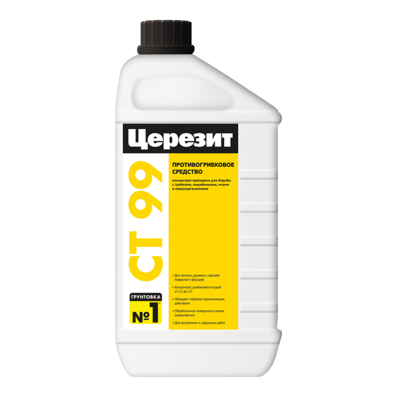 Препарат Ceresit CT 99 предназначен для борьбы с грибками, лишайниками, мхами и микроорганизмами при выполнении ремонтных работ на минеральных основаниях.