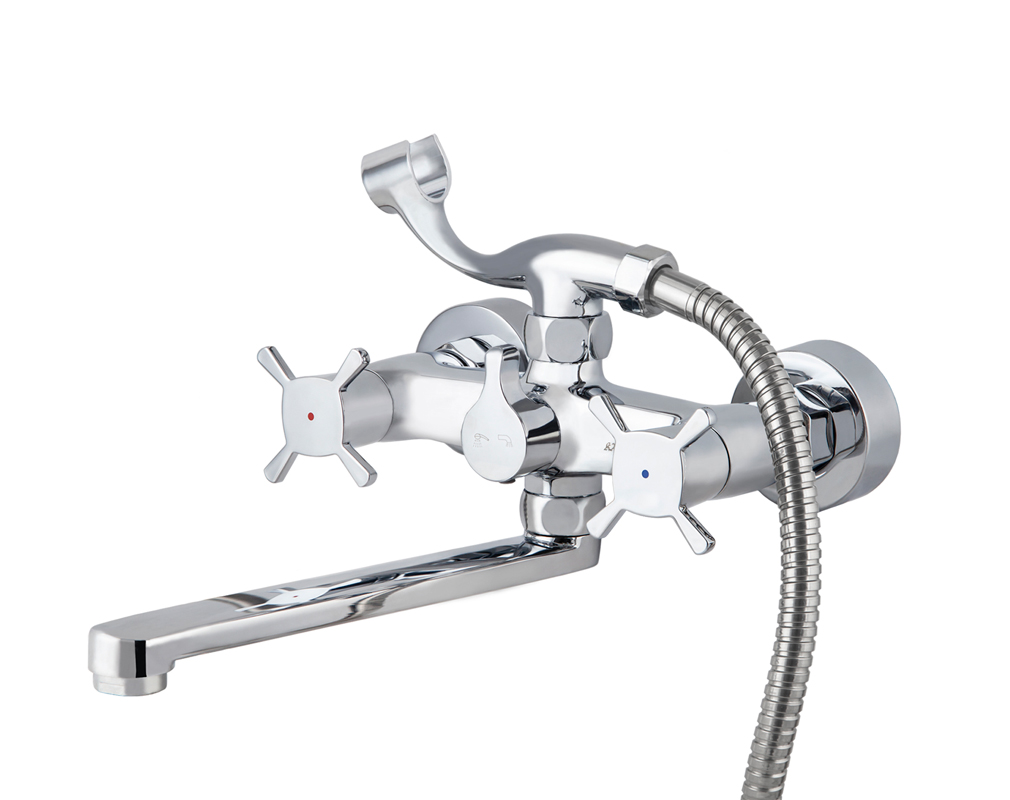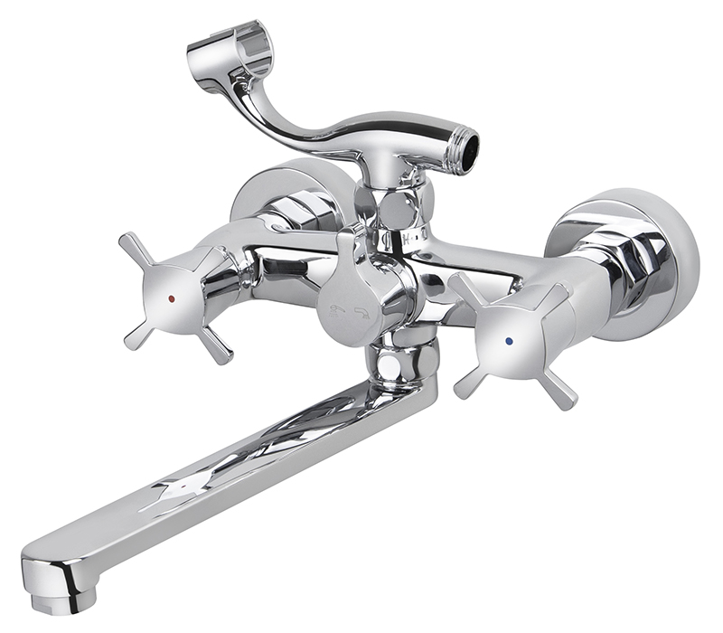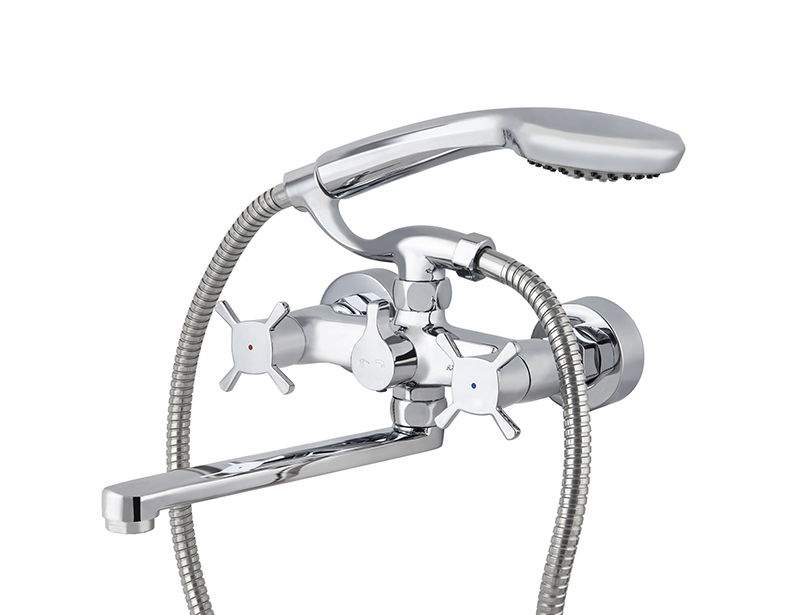 Смеситель для ванны с двумя рукоятками и коротким изливом.