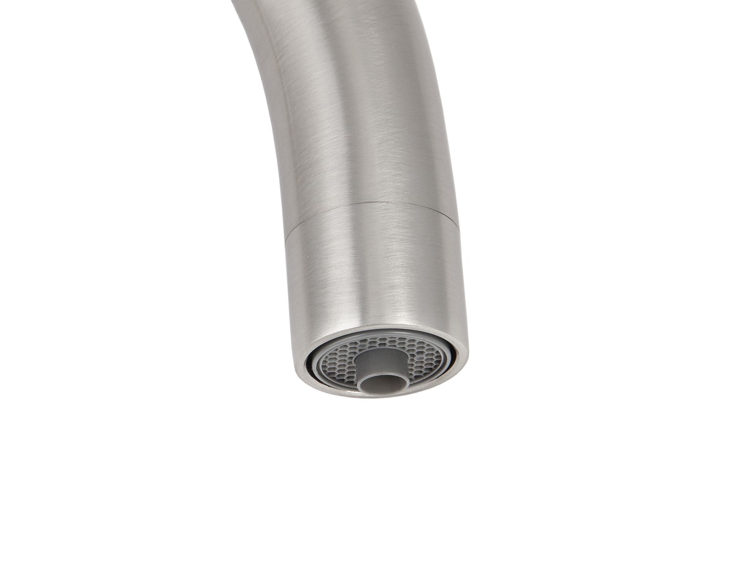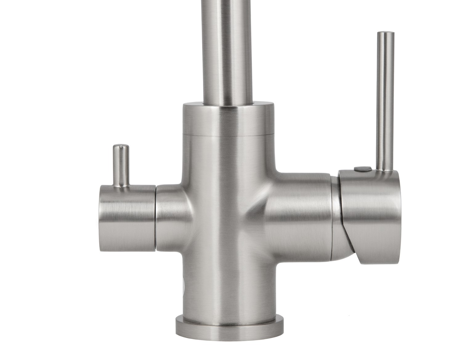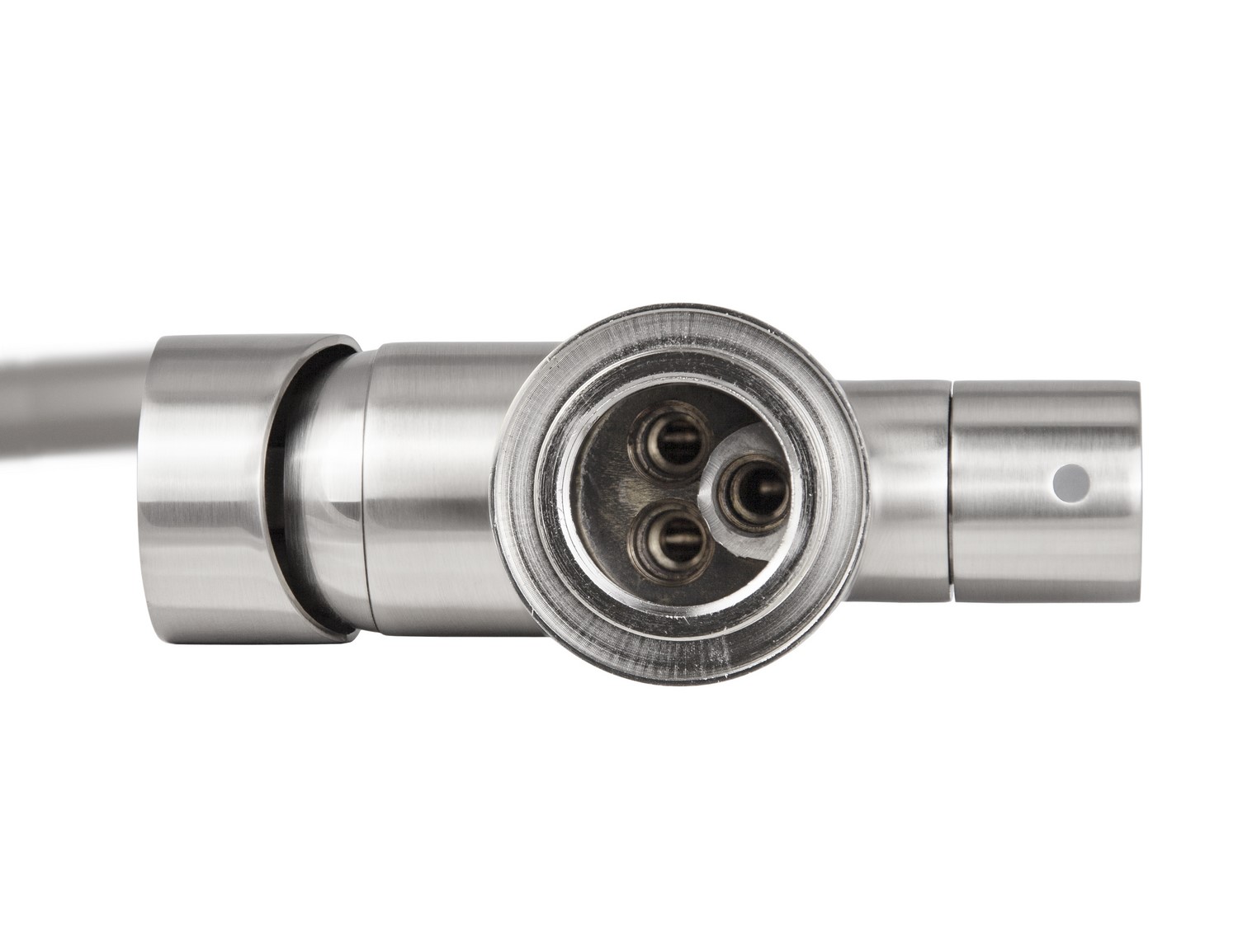 Смеситель Kaiser 26744-5 из коллекции Merkur с подключением под фильтр. Смеситель имеет сдвоенный аэратор, внутри излива проходит трубка для фильтрованной воды, что исключает возможность смешивания с проточной водой. Для подачи питьевой воды на корпусе смесителя размещен рычаг. Преимущество совмещенных смесителей заключается в том, что не нужно делать дополнительных отверстий на мойке и устанавливать отдельный кран для питьевой воды.