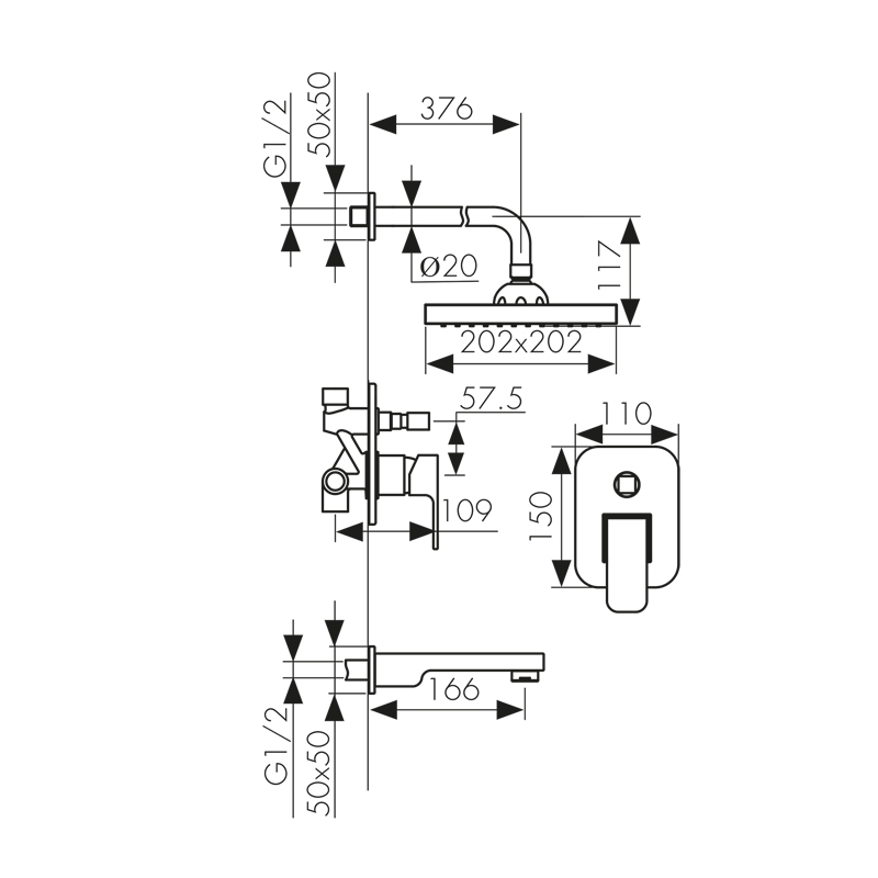 смеситель скрытого монтажа; верхний душ; кронштейн; излив; крепления |