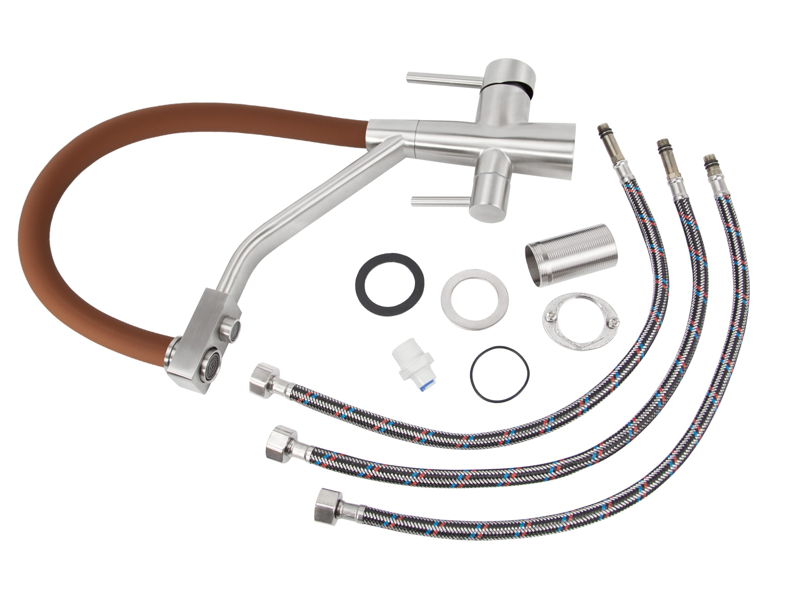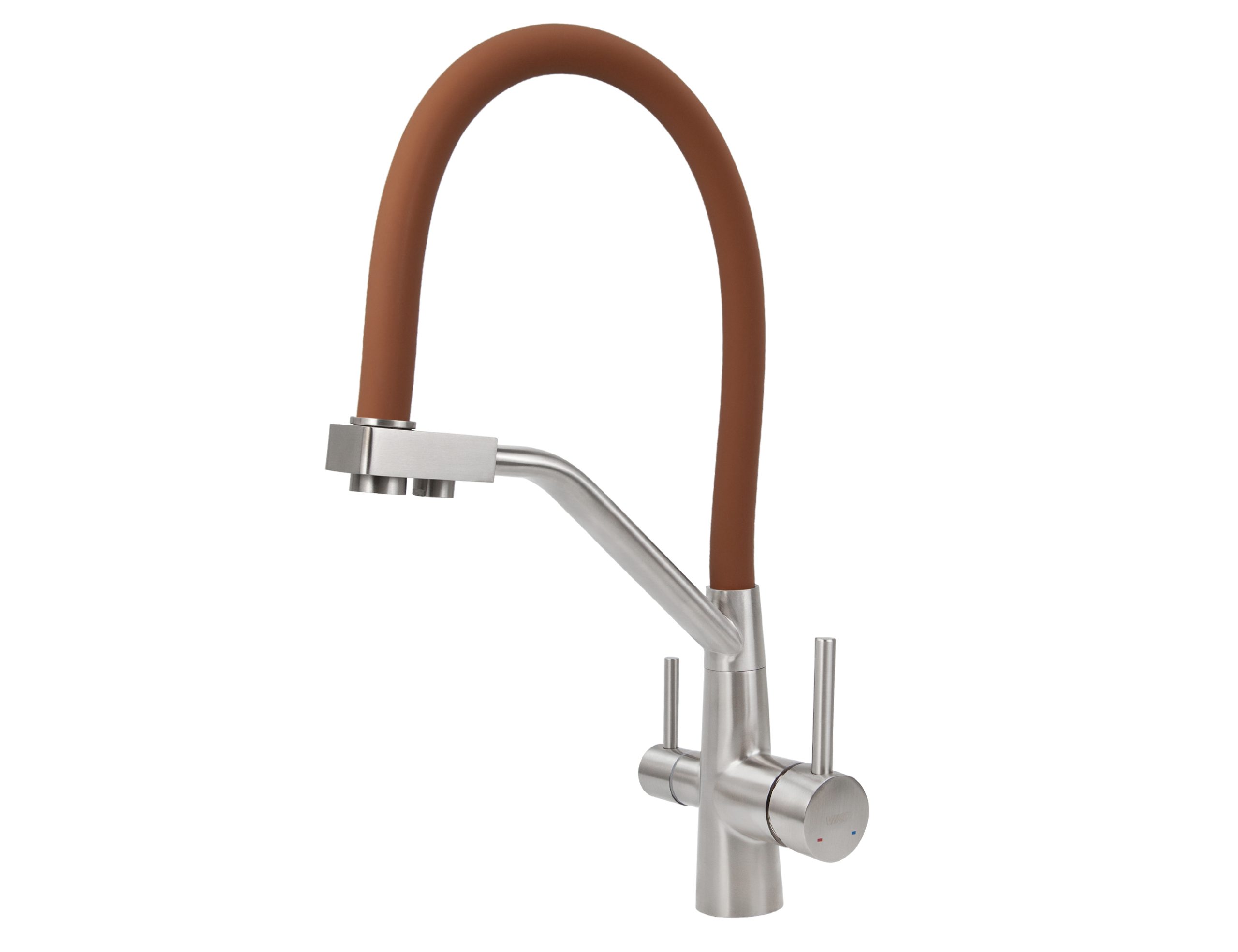 Смеситель VIKO для кухни под фильтр с гибким изливом Ø35, нерж. сталь (корпус/излив: серебро/коричневый)